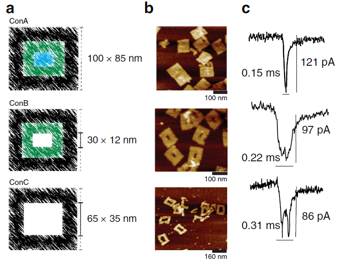 图2:a)同心方形DNA折纸纳米结构示意图,b)AFM显微镜下三种DNA折纸器件成像图,c)三种器件对应的易位离子电流特征。