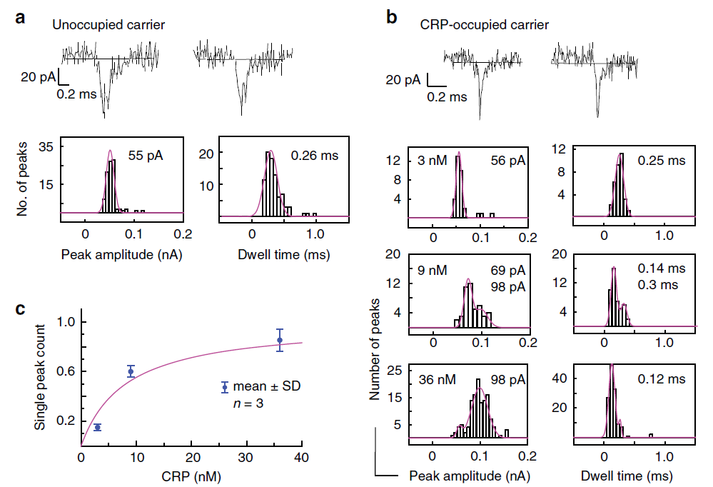 图4:a)未结合CRP分子的DNA纳米器件易位离子电流特征、振幅和停留时间变化,b)结合人血浆稀释液中不同浓度CPR分子的DNA纳米器件易位离子电流特征、振幅和停留时间变化,c)随CRP分子浓度增加,电流峰中单峰信号出现概率的相关性曲线。