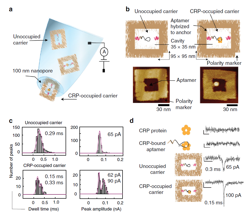 图3:a)以DNA纳米结构为基础的生物传感器检测示意图,通过纳米管的易位电流作为传感机制,b)结合CRP和未结合CRP的纳米器件AFM成像示意图,c)DNA纳米器件(9 nM)和CRP蛋白(9 nM)孵育后检测的振幅和停留时间,d)CRP、CRP- DNA适配体复合物、未占据载体和CRP结合的已占据载体的典型离子电流特征。