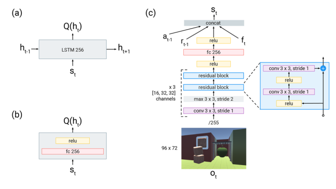 图2 (a)R2D3算法使用的循环神经网络;(b)DQfD使用的全连接神经网络,(a)和(b)均用于计算状态价值;(c)R2D3网络整体架构。