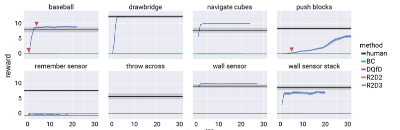 上图描述了Hard-Eight任务套件上R2D3的奖励与基线算法的差异。将这些曲线基于每个任务5个不同种子进行随机实验所绘制而成。误差区域显示了算法平均收益95%的置信区间。R2D3可以在棒球,吊桥,导航多维数据集和墙壁传感器上达到人类水平或更高的水平。R2D2无法在任何任务上获得任何积极的回报。相比之下,DQfD3(Deep Q-learning from Demonstrations)和BC(behavior cloning)算法偶尔会在Drawbridge和Navigate Cubes任务上得到奖励,但在大部分场景中无法获得奖赏,以至于在图中看不到训练效果。