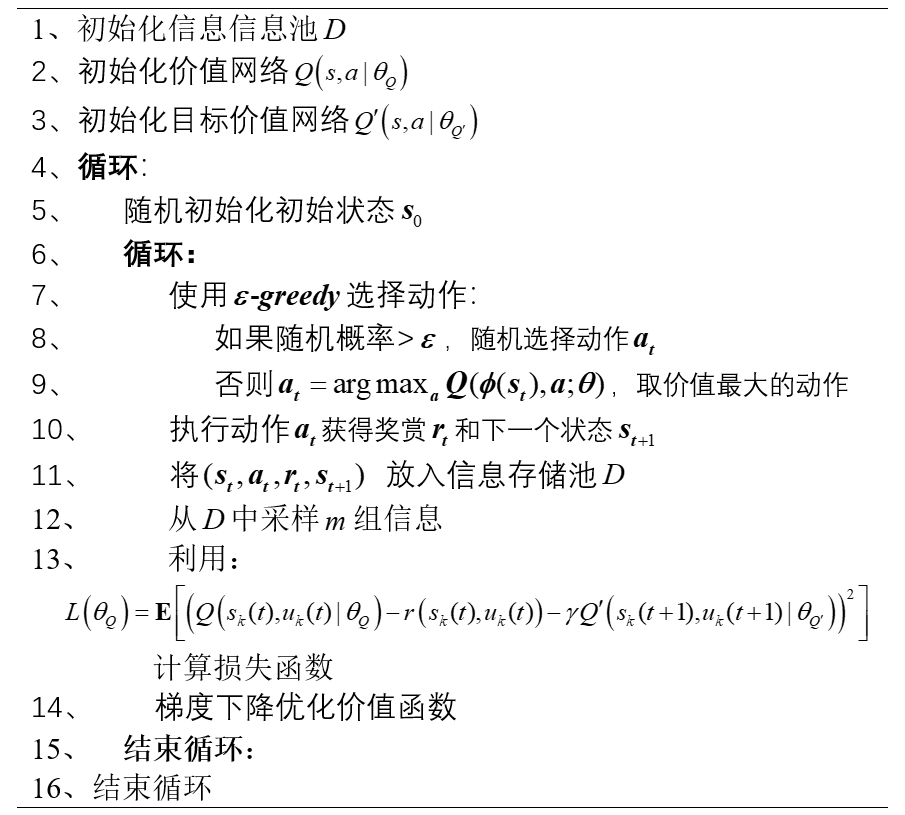 上图(a)表示R2D3使用了LSTM(Long Short-Term Memory)来构成价值网络的输入层,为什么这样做?是因为LSTM能够存储历史的参数信息,因此可以记忆整个探索空间中的状态行为,这解决了不确定性初始状态带来的探索学习困难的问题。上图(b)是DQfD算法价值网络,是一个常见的全连接层,通过relu 激活函数给出输出,其没有存储历史信息的功能。上图(c)是价值网络的整体架构,由卷积神经网络提取图像信息作为状态传入价值网络。而价值网络的更新以及动作的选取则与2014年的DQN论文一致2。DQN伪代码如下:
