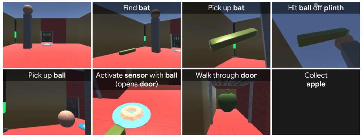 图3. 实验环境,八个实验环境分别为网球, 过桥, 冰块漂流, 推箱子, 记忆传感器, 过十字路口, 墙体传感器, 壁面传感器(从左到右从上到下)