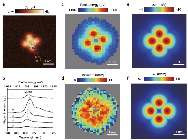 最后,作者展示了如何通过亚纳米级分辨率的PL成像研究等离激元-分子相互作用。他们分析了针尖在不同位置的PL光谱的峰强度、能量和谱宽。如图4b所示,当针尖位于ZnPc叶瓣位置的时候,有最强的荧光发射强度,并伴随着能量红移和谱峰展宽,后两者与等离激元-分子相互作用相关。通过绘制谱图能量和谱宽的全景图(图4c, d),可以区别出ZnPc分子叶瓣和叶瓣之间的能量差有2 meV,而两者之间的距离只有~0.6 nm。理论模拟的结果可以很好地吻合实验观察的现象。