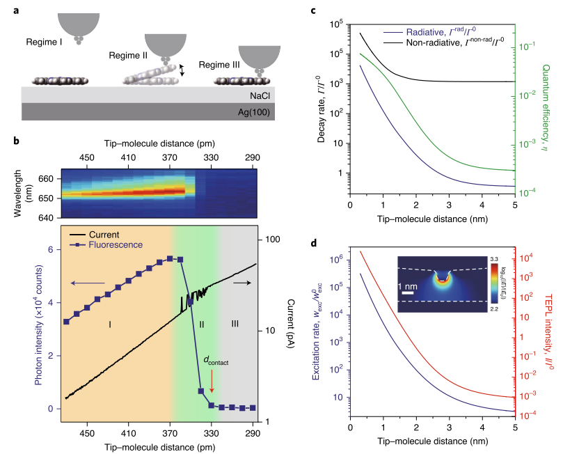 图3. 通过记录在不同针尖-分子距离下TEPL光谱强度的变化,揭示ZnPc分子在等离激元纳米腔中的光物理特性。(a)TEPL中三种不同区域下针尖-分子距离的示意图;(b)上:不同针尖-分子距离的TEPL光谱瀑布图,下:PL光谱强度与针尖距离的关系曲线;(c)不同针尖-分子距离下的辐射和非辐射衰变率和量子效率的模拟结果;(d)在不同的针尖-分子距离下激发率和TEPL强度的模拟结果。