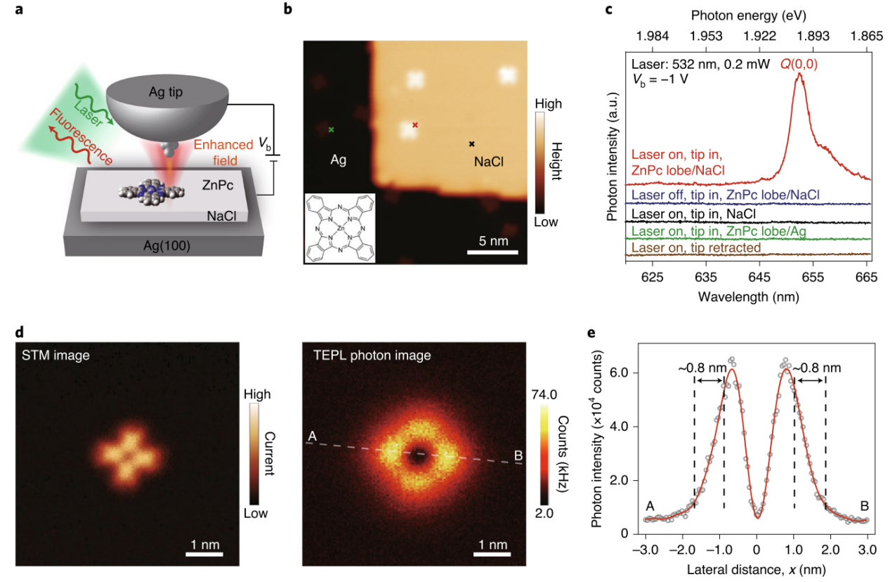 图1. 亚纳米级分辨率的单分子TEPL成像。(a)等离激元纳米腔增强电致发光示意图;(b)孤立ZnPc分子的STM图像;(c)不同条件下的TEPL光谱;(d)单个ZnPc分子的STM图像和对应的TEPL光子图像;(e)沿着(d)右图的白色虚线AB绘制的光子强度分布图。