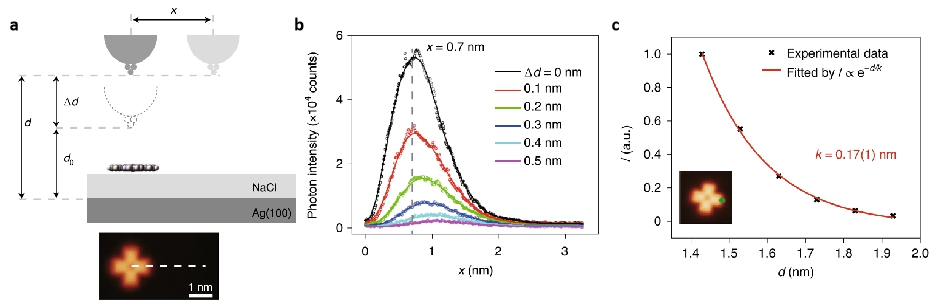 为了探究单分子TEPL光子图像分辨率与NCP结构的关系,作者通过控制STM针尖和基底之间的距离(图2a),发现光致发光强度随着间距的增大逐渐减弱,并呈指数衰减(图2b, c)。