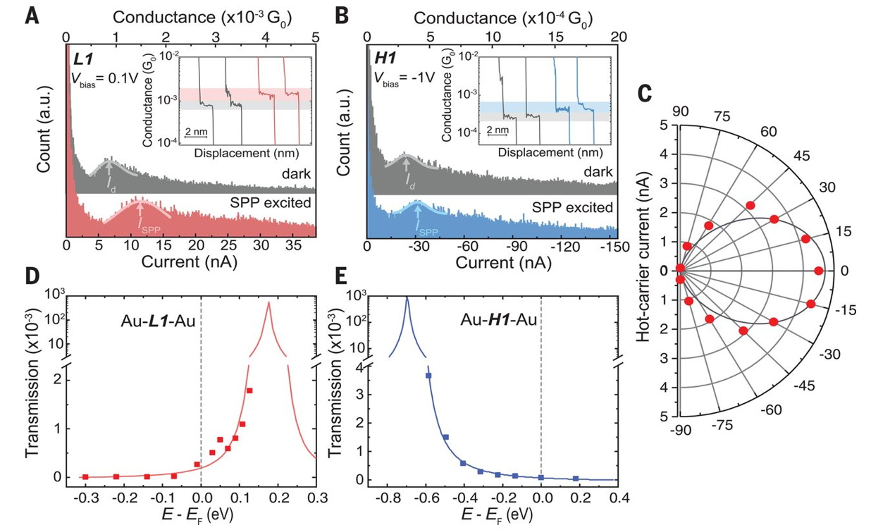 获取热载流子电流强度:基于上述思路,研究人员先获得在0.1 V偏压下的热载流子电流Ihot。在扫描探针针尖施加0.1 V的偏压,同时将芯片接地。通过扫描隧道显微镜裂结技术,得到无等离子体激发时单分子结Au-L1-Au的电流(Id)和相应的电导值,8.5×-4 G0(G0为电导量子,约为(12.9 kΩ)-1)。同样地,在-0.1 V 偏压下,得到分子结Au-H1-Au的电流电导曲线。接着通过用830 nm的线偏振光去垂直照射光栅以在金片上产生表面等离子体,测得相应的电流ISPP,据此可以得到0.1 V偏压下热载流子的电流强度,Ihot(Vbias=0.1 V)=ISPP(Vbias=0.1 V)–Id(Vbias=0.1 V)。但是这样的结果也可能是光照的热效应或光辅助电荷转移引起的,研究人员通过改变激发线偏振光的偏振角度进行对照实验。实验结果表明通过分子结Au-L1-Au的热载流子电流强度Ihot随着入射光偏振方向的变化而发生明显的变化,表现出偏振极化依赖性。这与极化相关的等离子体的激发效率一致,说明测量得到的Ihot是由等离子体的激发引起的。最后为了得到相关分子结的电荷传输透射函数,研究人员在相同的探针位置,改变偏压Vbias对单分子结Au-L1-Au和Au-H1-Au分别进行了多次测量,得到了相应的分子结电荷传输透射函数。