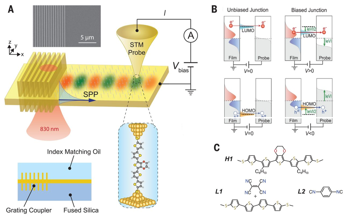 图1 测定热载流子能量分布的实验装置和设计原理。(A)实验装置示意图。附有光栅的金膜上施加830 纳米线偏振光用以激发热载流子。在光栅外缘放置扫描金针尖,协同金膜形成分子结。通过外回路测量通过分子结的电流;(B) LUMO或HOMO占主导的单分子结选择性地传输热载流子的示意图。对分子结的不同偏压使电荷传输峰值相对于平衡费米能级发生位移,使热载流子能量分布在一定的能量窗口中得以量化;(C) 用以构成单分子结的分子结构。