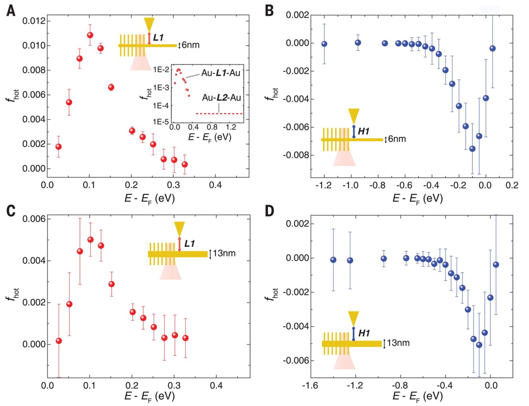 图3 (A) 6 纳米厚金膜上测得的热电子能量分布; (B) 6纳米厚金膜上测得的热空穴能量分布; (C) 13 纳米厚金膜上测得的热电子能量分布; (D) 13 纳米厚金膜上测得的热空穴能量分布