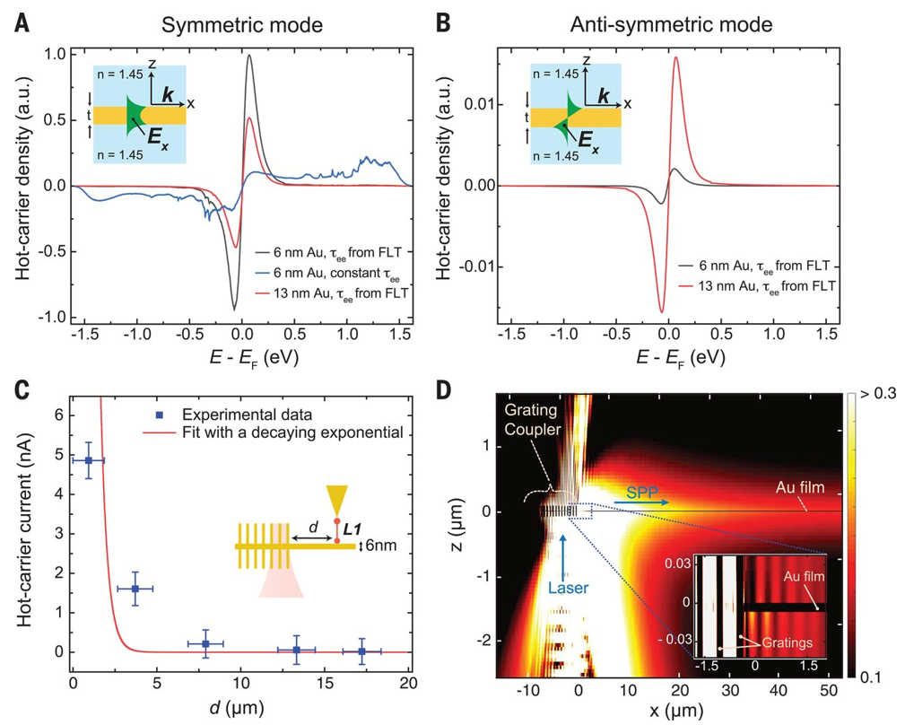 图 4 (A) 热载流子在对称场中能量分布的理论计算; (B) 热载流子在不对称场中能量分布的理论计算; (C) 热载流子电流强度和探针距离的关系;(D)模拟的热载流子密度分布,内置图为在光栅边缘的热载流子强度分布。