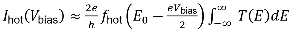 其中e为电子基本带电量,h为普朗克常数,E0为分子接投射函数T(E)中的能量峰值。因此在上述实验装置中,研究人员通过在窗口{-V0:V0}中改变偏压Vbias,得到每一个偏压下的载流子能量值,最后通过对上述多个能量值的拟合,可量化得到稳态热载流子在窗口
