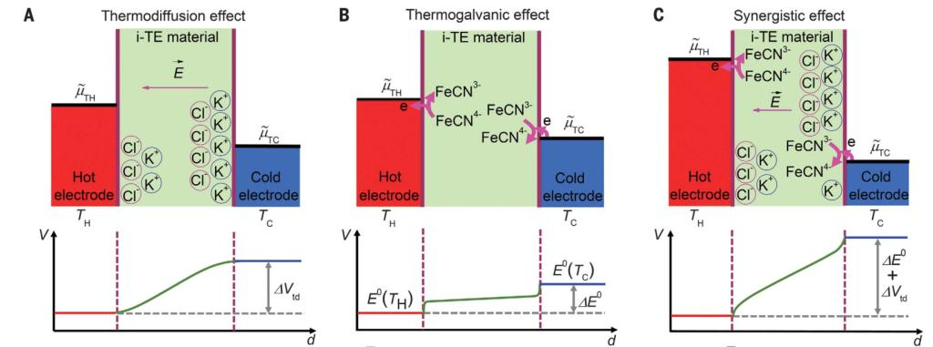 图2协同效应的机理,Gelatin- xMX-m/n FeCN4–/3–i-TE材料的电化学势和相应的电压分布图(A)Gelatin-KCl (x = 0.8M, m/n = 0 M), E代表产生的电场。(B)Gelatin- FeCN4–/3– (x = 0M, m/n = 0.42/0.25 M FeCN4–/3–)。(C)Gelatin-0.8M KCl-0.42/0.25 FeCN4–/3–。