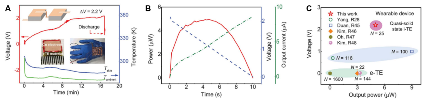 图4可穿戴i-TE设备(A)柔性i-TE可穿戴设备产生的电压,该设备带有25个单极元件(Cu | i-TE | Cu,5×5×1.8 mm,光滑的铜箔)串联连接,设备可穿戴在人的手背。(B)通过收集人体的热量来测试可穿戴i-TE设备的功率(线),电压(虚线)和输出电流(虚线点线)曲线。(C)穿戴在真实人体上的e-TE材料和准固态i-TE材料的可穿戴设备的输出电压和功率的性能比较。N表示可穿戴设备中n型或p型热电元件的数量。