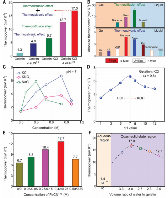 图1 i-TE材料的巨大热电势。(A)比较Gelatin-x MX-m/n FeCN4–/3–制成的离子热电材料的热电势。在这个工作中,Gelatin(x = 0 M,m/n= 0 M),Gelatin-FeCN4–/3–(x = 0 M,m/n = 0.42 / 0.25 M),Gelatin-KCl(x = 0.8 M,m/n = 0 M)和Gelatin-KCl- FeCN4–/3–(x= 0.8 M,m/n= 0.42 / 0.25 M,水与明胶的体积比rv= 2.0和3.0)。(B)包含热扩散效应或热电流效应的i-TE材料的绝对热功率对比。填充和未填充的列分别表示p型和n型热电。(C)不同浓度的KCl,KNO3和NaCl的Gelatin-x KCl,Gelatin-xKNO3和Gelatin-x NaCl的i-TE材料的热电势。(D)Gelatin-x KCl的i-TE材料的热电势,分别通过HCl和KOH调节pH值。(E)X = 0.8 M的Gelatin-x MX-m/n FeCN4–/3–i-TE材料的热电势.(F)水和明胶体积比与热电势的关系。