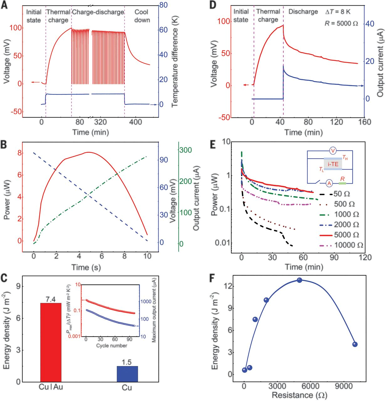 在摸索到优化热电势的最佳条件后,研究人员设计组装了具有Cu|Au|i-TE|Au|Cu层状结构的i-TE电池。将冷端保持在293 K,热端保持在301.5 K(∆T= 8.5 K),对电池进行充电55分钟至高(近饱和)电压,然后将其逐步转为准连续工作模式。通过外部电路连接,电池在10 s内放电至0 V,然后在相同的温差下开路3分钟恢复到高电压。电池在5个小时的时间内完成了100个这样的充放电循环(图3A),而第五循环周期的相应功率-时间曲线呈现出抛物线的形状,达到最大值8 μW(图3B)。可以看到,输出功率随着准连续循环数的增加而降低(图3C,插图),这可能是由于电极的极化引起的,研究人员通过消除温度差和完全冷却电池的方法解决了这个问题。另外,考虑到电极腐蚀的问题,研究人员在铜箔电极上涂覆了金,发现最初50个循环的总能量密度(7.4 J m-2)比铜箔电极(1.5 J m-2)高得多(图3C);对带有镀金铜电极的i-TE电池以∆T= 8 K进行热充电,达到接近饱和的电压,然后以相同的∆T通过5000Ω外部电阻进行放电(图3D),可以看到输出电压和输出功率最初迅速衰减,但最终随着外部电阻饱和至一个恒定值,达到稳态热电流运行模式(图3E)。研究人员进一步计算了一系列外部电阻值的能量密度,在12.8 J m-2处达到饱和(图3F),该值高于准连续工作模式下的值(图3C)。