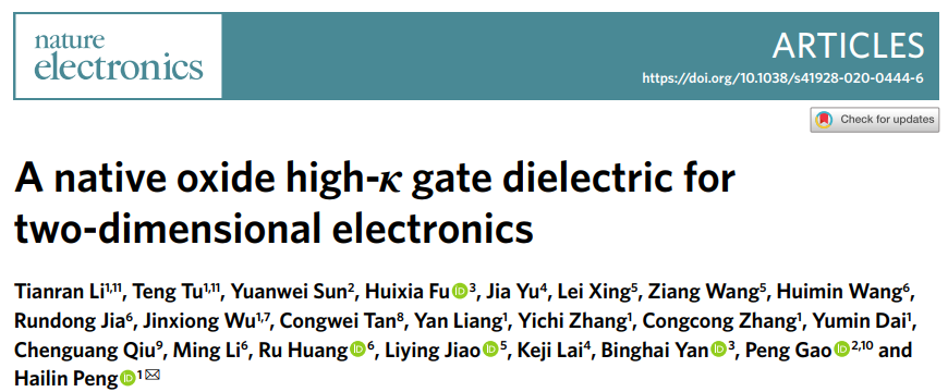 文章导读:硅基半导体是目前微电子工业的主流材料,但是二氧化硅较低的介电常数限制了其在先进制造工艺中的应用。开发具有高介电常数(ε>10)的超薄高质量氧化物介电层已成为该领域的一个主流研究方向。近日,北京大学彭海琳教授课题组首次将高迁移率的二维半导体表面氧化成高κ栅介质,并进一步将其应用于高性能场效应晶体管的构筑和逻辑门电路的研究。