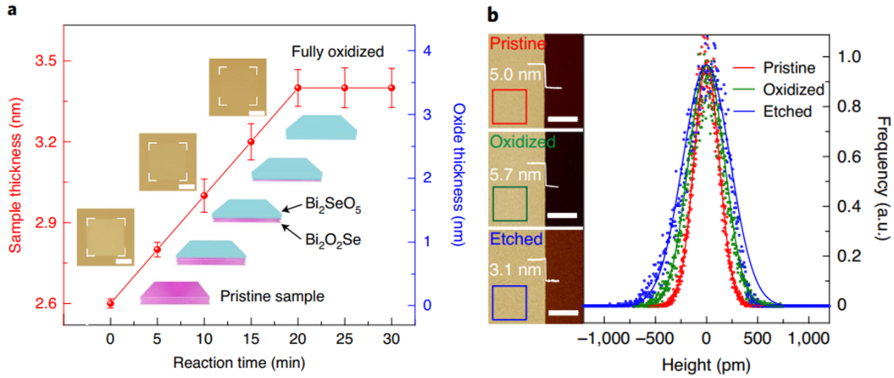 图2. 层状Bi2O2Se的可控氧化和Bi2SeO5的选择性蚀刻。(a) 时间依赖的Bi2O2Se氧化;(b)Bi2O2Se纳米板(红色)的高度和表面粗糙度测量,Bi2O2Se/Bi2SeO5氧化后(绿色)和顶部Bi2SeO5的蚀刻后(蓝色)。