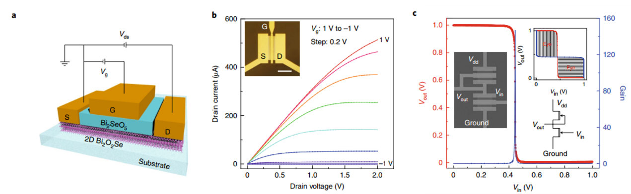 图4. 顶栅为Bi2O2Se/Bi2SeO5的场效应晶体管和逆变器电路。(a) Bi2SeO5作为介电层的场效应晶体管示意图;(b) Bi2O2Se/Bi2SeO5场效应晶体管的输出特性;(c)逆变器的电压传输特性。