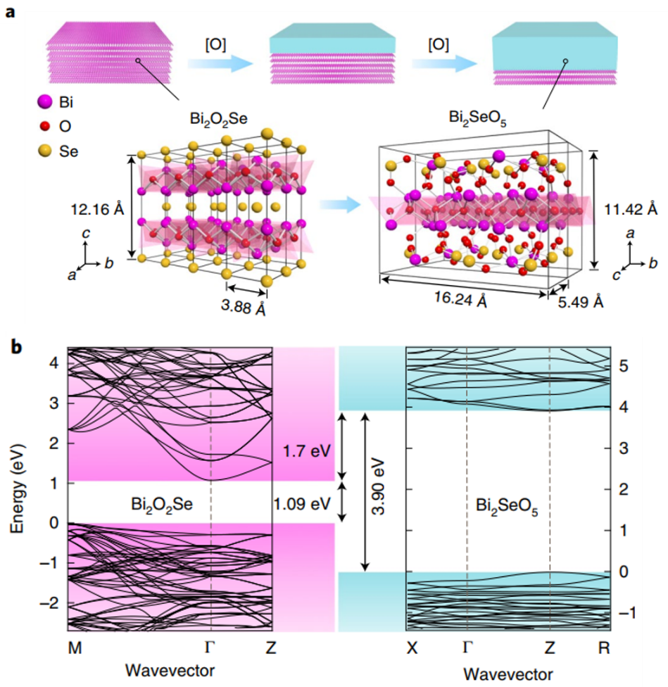 图1. 晶体和电子结构。(a)层状 Bi2O2Se和其天然氧化物Bi2SeO5的晶体结构;(b) Bi2O2Se和Bi2SeO5之间能带排列的能量图。