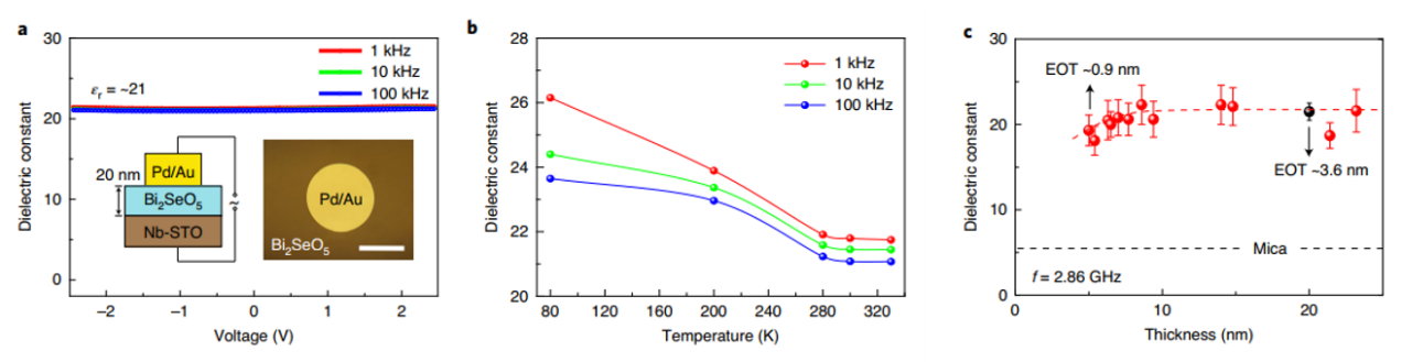 为评估Bi2SeO5作为栅极电介质的潜力,研究者测试了Bi2SeO5薄膜的介电性能。图3a为用于电容-电压(C-V)测量的器件构型(金属-绝缘体-金属),其中20 nm厚的Bi2SeO5膜夹在顶部Au电极和导电Nb-SrTiO3衬底之间。对于直流偏压范围为-2.5至2.5V,介电常数εr为21且没有波动,这表明Bi2SeO5是稳定的高κ电介质材料。温度依赖性的测量结果表明Bi2SeO5在280-330 K范围内(接近室温)具有高κ值(图3b)。当氧化物厚度低于20nm时,器件的C-V测试变得困难,这是由于在高偏压具有相对大的漏电流。如图3c,Bi2SeO5介电常数约为21,在厚度低于5 nm时稍微降低,其对应的等效氧化物厚度(EOT)小到0.9 nm。