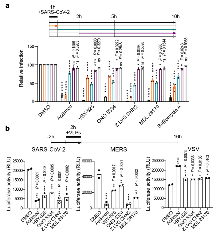 图5:Apilimod和蛋白酶抑制剂可阻止SARS-CoV-2侵入。a: 加药时间的研究;b:病毒样颗粒(VLP)测定。
