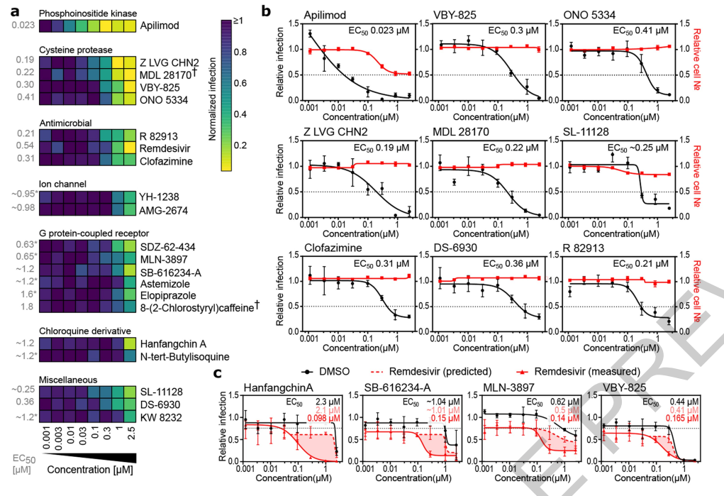 图4:所选抗病毒化合物的剂量反应关系以及与瑞德西韦的协同作用。 (a-c)用递增浓度的所示化合物预处理Vero E6细胞16小时,然后以MOI = 0.01感染SARS-CoV-2。感染24小时后,将细胞固定,并进行免疫荧光成像。对于每种情况,将感染百分比计算为CoV NP染色的感染细胞数与DAPI染色的细胞总数之比。