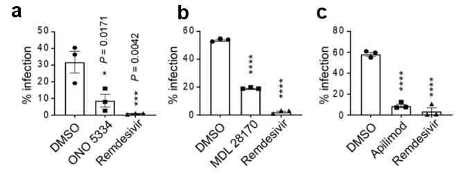 研究者进一步评估了ONO 5334,MDL 28170和apilimod在人的多能干细胞(human pluripotent stem cell,hPSC)衍生的肺细胞样的细胞中的抗病毒活性。先分化细胞,然后分别与此三个化合物一起孵育,同时用SARS-CoV-2攻击。抗病毒药物治疗可显著减少病毒在这些原代细胞中的复制。ONO 5334将感染细胞的数量减少了72%(图6a),MDL 28170减少了65%(图6b),而apilimod则阻断了85%的SARS-CoV-2攻击(图6c)。