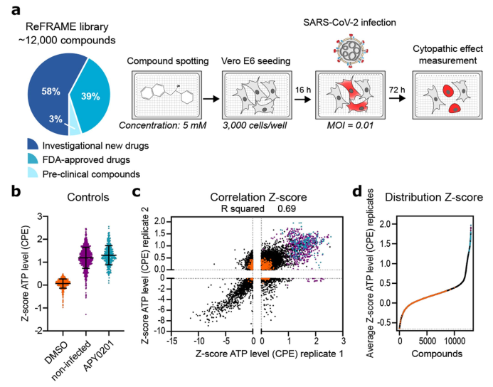图2:用于SARS-CoV-2抗病毒药物的高通量重排筛选--来自ReFRAME库初步筛选的数据。a:用于ReFRAME库重新定位分析的筛选策略示意图。b:对于SARS-CoV-2感染的所有阳性(APY0201)和阴性(DMSO)对照组,以及非感染细胞,在所有筛选板中,归一化后ATP水平的Log2 倍数变化 (Log2FC),即Z值。误差条表示n=375的平均值±标准差;c: 相关图表明在两次重复筛选中每种化合物的活性(Z值);d:根据每个重复的z值的平均值,每种化合物的活性分布。
