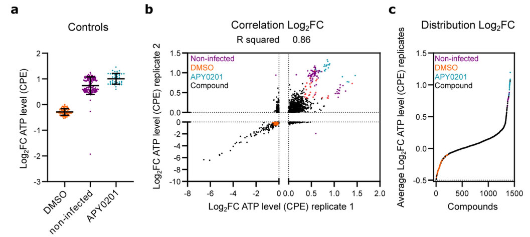 图1:用于SARS-CoV-2抗病毒药物的高通量重排筛选--来自LOPAC®1280库初步筛选的数据。a:对于SARS-CoV-2感染的所有阳性(APY0201)和阴性(DMSO)对照组,以及非感染细胞,在所有筛选板中,归一化后的ATP水平Log2 倍数变化(Log2FC)。误差条表示n=40的平均值±标准差;b: 相关图显示两个重复筛选中每个化合物的Log2FC;c:根据每个病毒增值物的Log2FC平均值,每种化合物的活性分布。