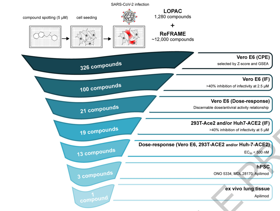本文利用生物活性分子库LOPAC作为基准线,高通量筛选已知的分子库ReFRAME,初步得到326个有效化合物,进一步经正交验证筛选得到100种化合物,再经过剂量反应与协同分析筛查出21有效化合物,由EC50< 500 nM标准再筛出13化合物。最后在人的多能干细胞(hPSC)实验中筛查出最有效的三种化合物ONO 5334,MDL 28170和apilimod,其中以apilimod最为有效,安全性也有所保障,但最终仍需体内实验评估(图7)。
