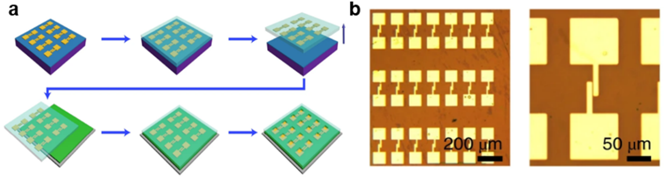 图2 a,用转移法合成范德华接触的流程示意图;b,在钙钛矿薄膜上的转移法所制备的金电极阵列图像