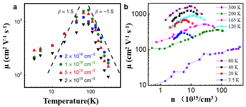 载流子迁移率是在各种不同温度和不同光照强度下得出的。在适当的照明功率下,研究者所测量获得了最高的室温霍尔迁移率,为118 cm2 V–1 s–1,在温度为80 K时增加到1650 cm2 V–1 s–1。在每个温度下,迁移率首先随照明功率的增加而增加,这是因为较大的载流子密度会增大费米波矢量,因此会导致散射过程中的动量变化更大,并降低了反向散射概率(图4a)。另一方面,随着密度的进一步提高,载流子-载流子的相互作用开始起主导作用,从而导致在更强的光照条件下的迁移率降低。通过对比所有实验样品的数据,发现在80 K条件下可实现的最高迁移率为2080 cm 2 V –1 s –1 (图4b)。