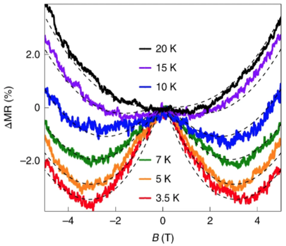 当范德华接触低至基准温度(Base temperature),研究者能够进行磁致电阻(Magnetoresistance, MR)研究并探究钙钛矿中的量子输运性质(图5)。当在T = 3.5 K时,该器件在低场显示负MR,而在高场显示为正MR。零场处的较高电阻可归因于量子干涉引起的弱局域效应(Quantum-interference-induced weak localization effect)即反向散射电子波函数的相长干涉增加了将电子局域的可能性。因此在零磁场时具有较高的电阻,而磁场的存在会破坏相位相干性和这种干涉效应,从而导致电阻降低和磁致电阻降低。