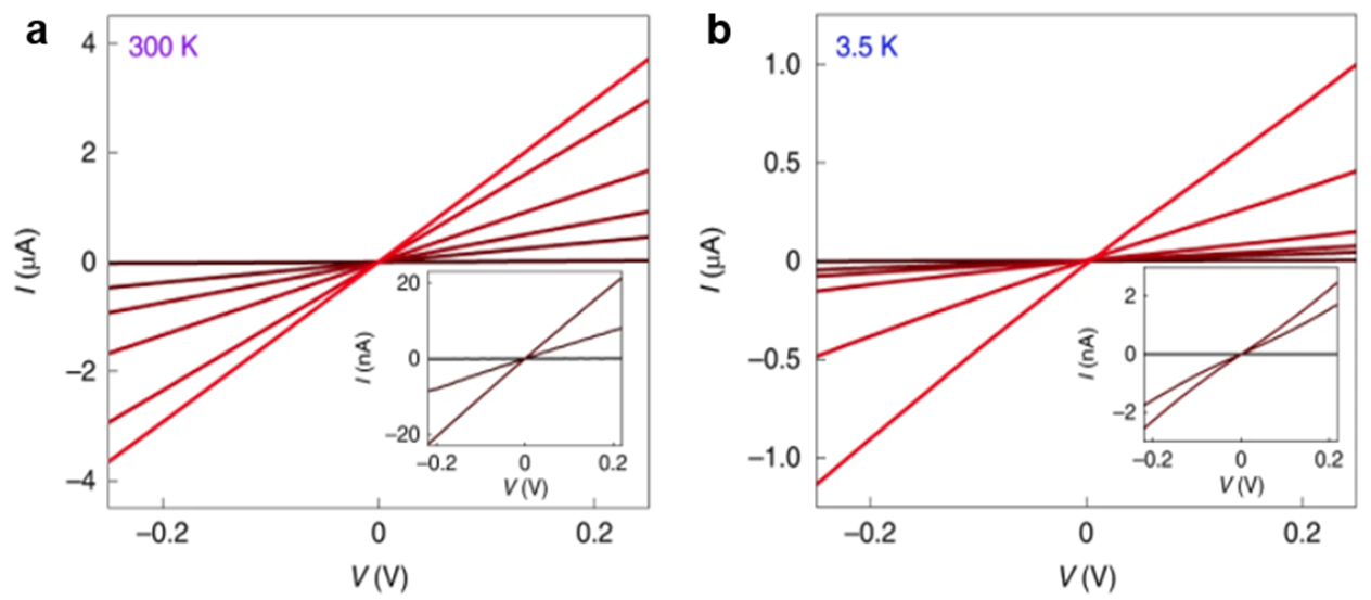 图3 范德华接触器件在各种光照强度下在室温(a)和3.5 K (b)下的I-V特性;每条曲线(从黑色到红色)的功率密度分别为0、0.01、0.1、0.9、1.9、3.8、9.4和18.8 mW cm-2。