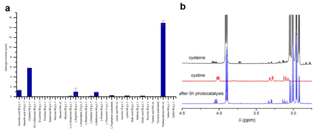 图2a:候选生物衍生牺牲空穴清除剂的析氢率。b:反应前后L-半胱氨酸的核磁氢谱