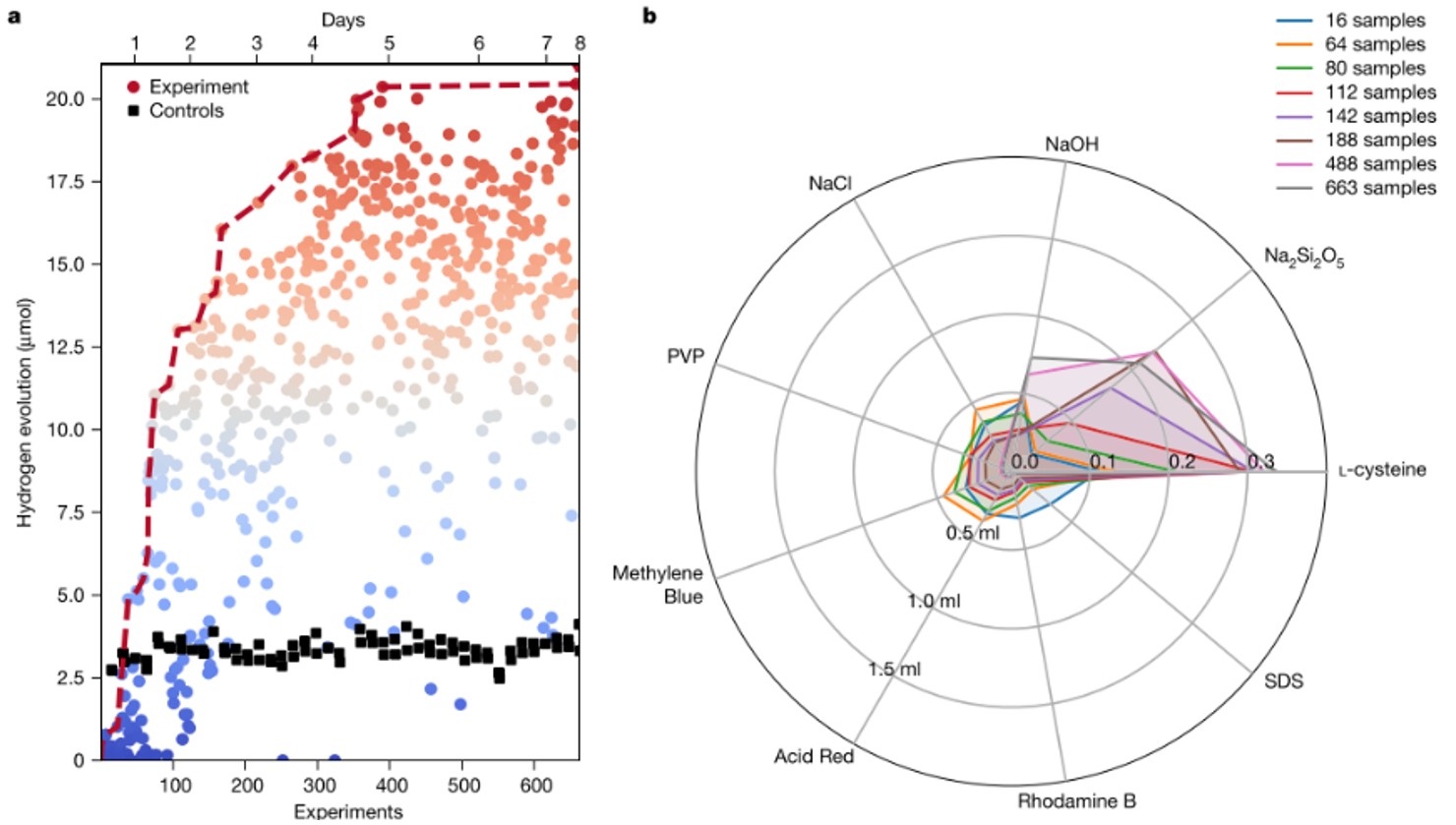 图4a:该图显示了在8天的自主搜索中每个实验的氢气释放量(共计688次实验)。b:以毫升为单位显示搜索空间平均采样演化的雷达图;刻度表示所分配的最大溶液的体积分数。