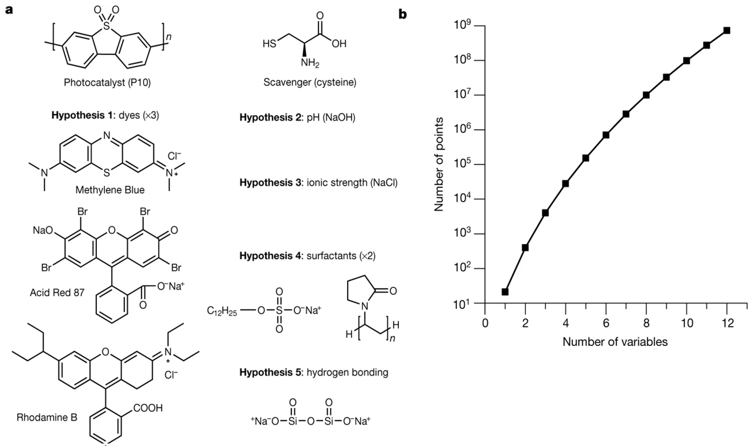 图3:虚拟主导的自主搜索策略。a:机器人根据五种不同的假设搜索化学空间以优化光催化剂+清除剂组合的活性。它同时改变这10种化学物质的浓度。b:图中显示了单个曲面或搜索空间的大小,对于这个十个变量的问题,完整的测试点有98,423,325个。