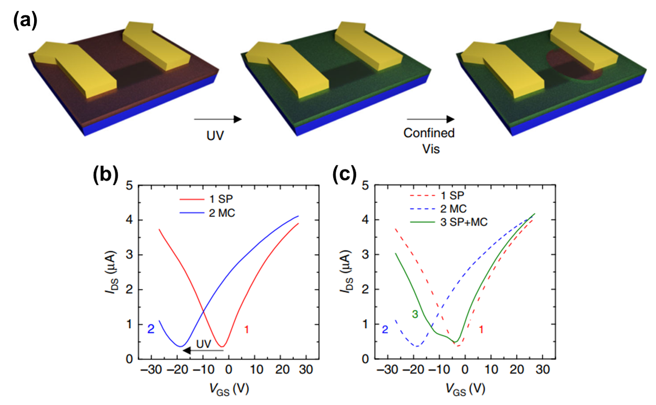 Fig. 5 (a)载流子密度的空间限制调制实验过程示意图。从左到右, SP分子层(暗红色)通过紫外照射后结构转变为MC分子层(绿色),通过局域可见光照射后,光照区域恢复为SP分子层。(b)SP分子层和MC分子层的IDS-VGS对比图。(c)可见光局部照射前后分子层的IDS-VGS对比图。