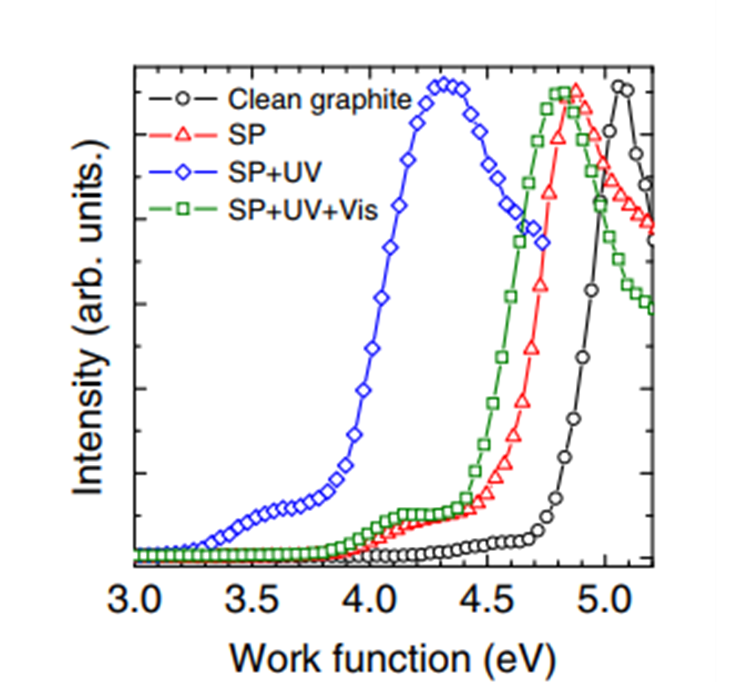 Fig. 3紫外光电子能谱测量得到的,光致变色分子自组装层异构化导致的HOPG基底功函数的变化过程。