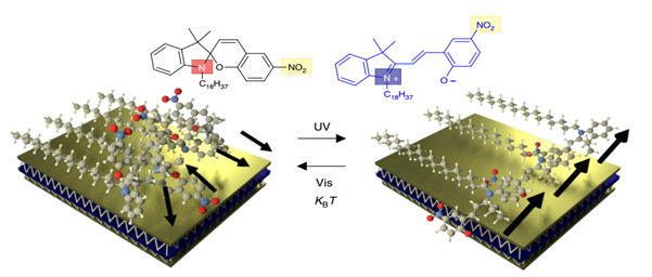 二维材料为研究其表面的分子自组装层和所构筑的分子器件的电输运性质之间的相互作用提供了一个理想的平台。螺吡喃分子(spiropyran,SP)作为一种典型的光致变色分子,在紫外光的照射下,SP分子中的中性闭环结构会发生异构化反应,形成两性离子的开环异构体-花青分子(merocyanine,MC),而在热或可见光照下,MC则会重新转变为SP。根据这一可逆的光异构化过程,研究者们分别以高定向热解石墨(HOPG)和MoS2作为基底,在其表面旋涂SP溶液,使HOPG或MoS2表面自组装上一层SP超晶格分子层,然后利用紫外光对干燥后的分子层进行照射,此时原本分子偶极取向随机分布的SP分子层通过光异构化形成偶极方向一致的、有序的MC单分子层超晶格结构,即紫外光照前后为两种不同的二维异质结分子器件。其原理如Fig. 1所示。