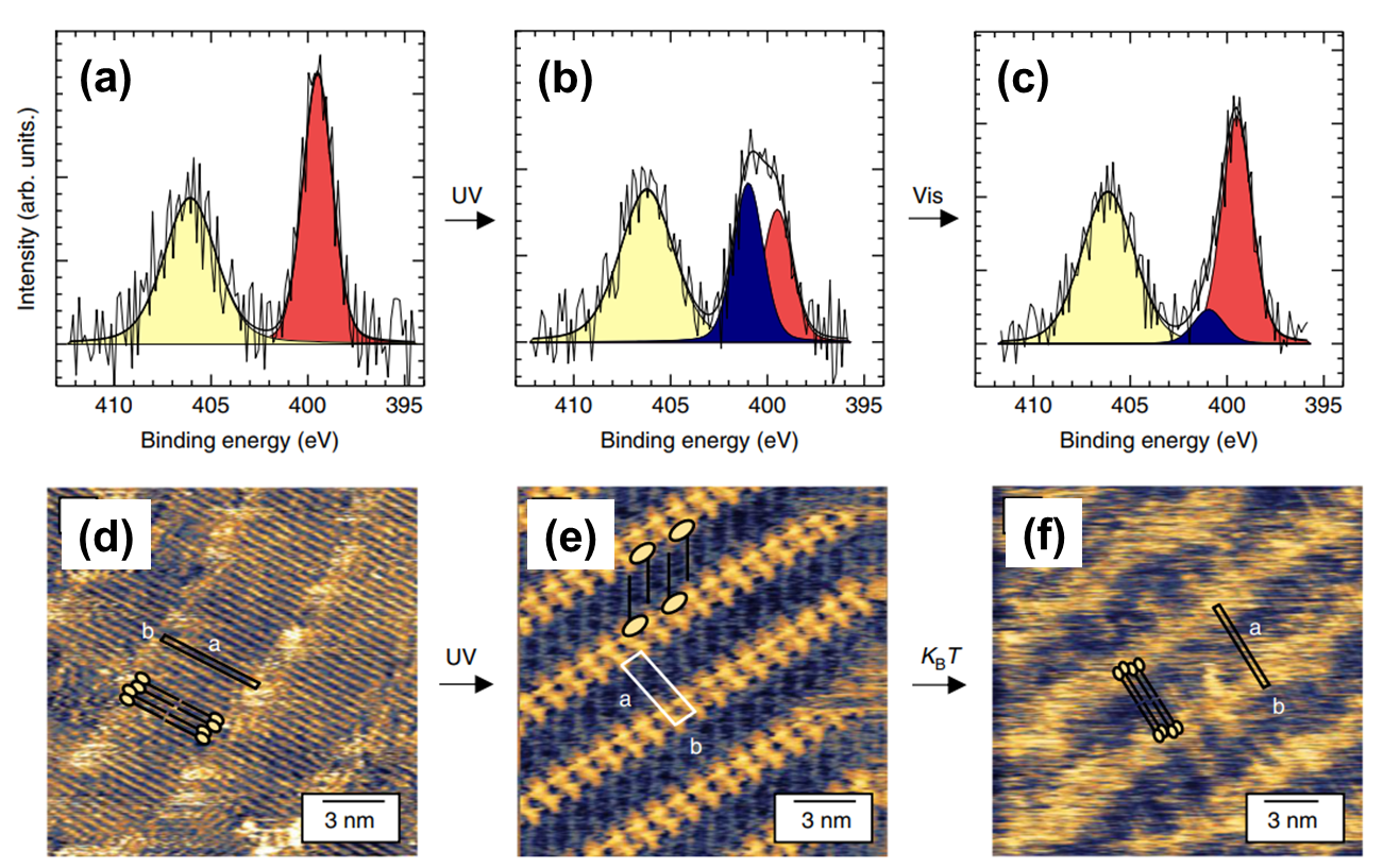 Fig. 2(a-c)对不同光照条件下旋涂于HOPG表面的分子层异构化的XPS表征(N1s)(d-f)HOPG上SP分子层结构演变的STM图像:(d)旋涂SP分子后,(e)直接紫外光照后,(f)紫外光照后48h。