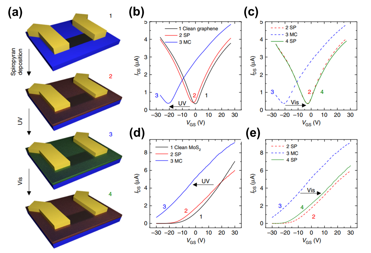 随后研究者们开始对所构筑的异质结器件的光开关电学性质进行的表征。Fig.4(a)为以HOPG为基底构筑异质结并测量其电学性质的示意图。从上到下依次为:没有旋涂光致发光分子的器件、旋涂有分子但没有光照的器件、紫外照射后的器件、紫外照射后又用绿光照射的器件。以HOPG为基底时,紫外光照射后,器件的转移曲线(IDS-VGS)形状保持不变,但整体向负方向移动(Fig.1.4b,蓝色线),表明SP转变为MC后,对HOPG实现了重度的n型掺杂。而随即用可见光照射后,曲线又移动回到原来的位置(Fig.1.4c,绿色线)。实验发现,以MoS2为基底时也有类似现象(Fig. 4d,e)。
