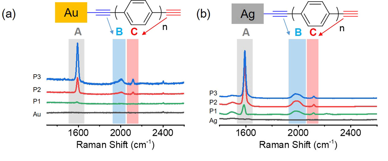 如图Fig4所示,作者通过将P1-P3分子分别组装到金基底和银基底上来测表面增强拉曼光谱,其中1952 cm-1和2117 cm-1处的峰分别归属为苯环和碳碳三键。先前的一些工作已经证实,如果碳碳三键上的碳以共价键锚定在金属界面上,则2117 cm-1处的峰会转移到2000 cm-1处,并且峰会变宽(J. Am. Chem. Soc. 2012, 134, 19425.)。所以在上图中也可以看到2000 cm-1处的峰可以分别指认为来自Au-C键和Ag-C键。