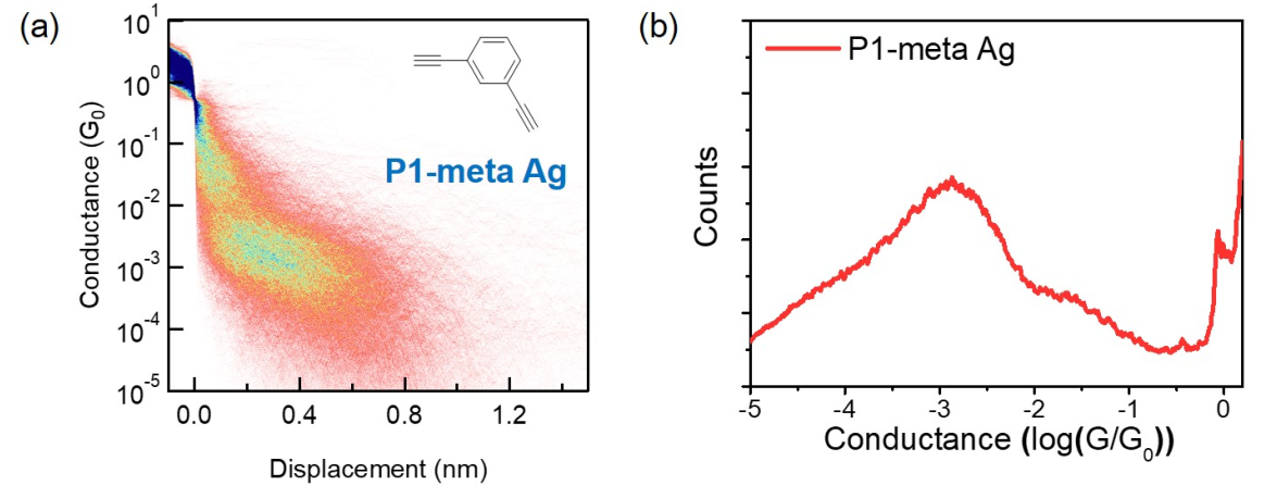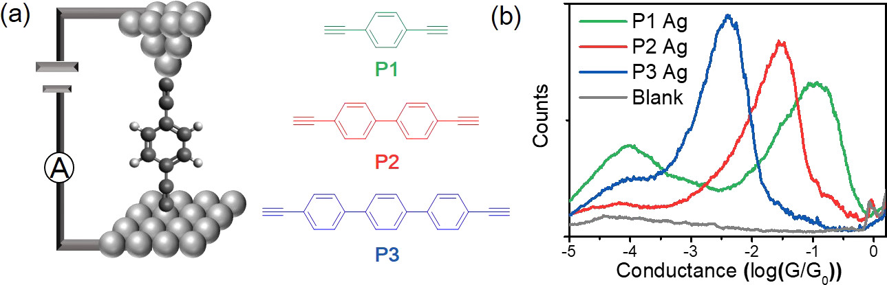 Fig1 a,电输运测量示意图以及三种乙炔末端分子导线P1-P3的分子结构;b,利用银电极测量目标分子得到的一维电导统计图。