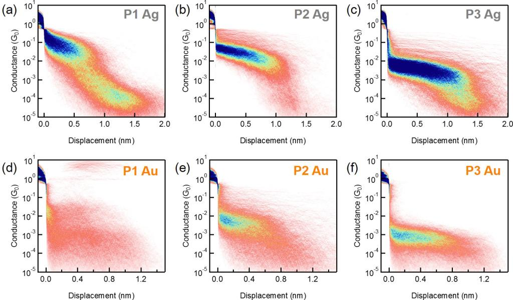 Fig2 a-c,利用银电极测量P1-P3分子得到二维电导强度图;d-f,利用金电极测量P1-P3分子得到二维电导强度图。