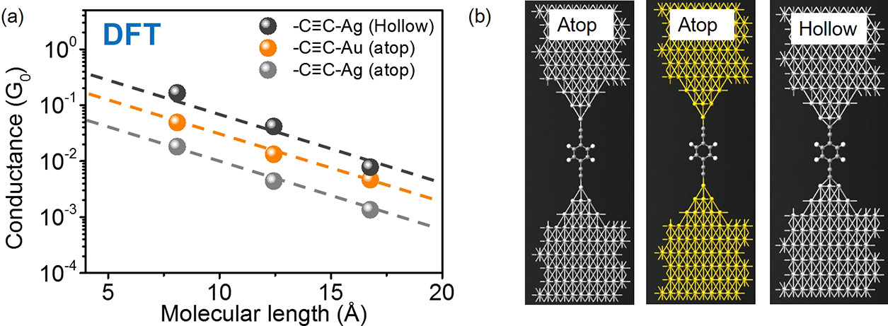 作者把三个分子分别采用-CH2-Au,-C≡C-Ag以及-C≡C-Au三种连接测得的分子电导对应分子长度做图。由量子隧穿模型可知G/G0 = A exp (-βL),其中A为接触电阻,β为分子衰减常数,L为分子股价长度。通过对同种末端连接的系列分子P1-P3的电导-长度连线,并反推至L=0处即可得到该分子与界面的接触电阻A。经过计算发现,-C≡C-Ag分子结的接触电阻为6 KΩ,-C≡C-Au分子结的接触电阻为36 KΩ,对比巯基锚定的40 KΩ和氨基锚定的189 KΩ, 由此可得出以Ag-C键构筑的分子结接触电阻明显小于Au-C键连接以及巯基锚定的接触电阻。