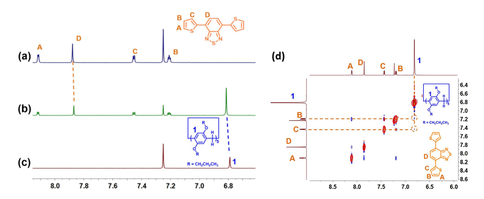 3  部分1H NMR谱图(500 MHzCDCl3293 K):(aDTBT; b)等摩尔(25.0 mM)的PrP5DTBT溶液;(cPrP5。(dDTBT5.00 mM)和PrP58.00 mM)溶液的部分NOESY NMR光谱(500 MHzCDCl3293 K)。