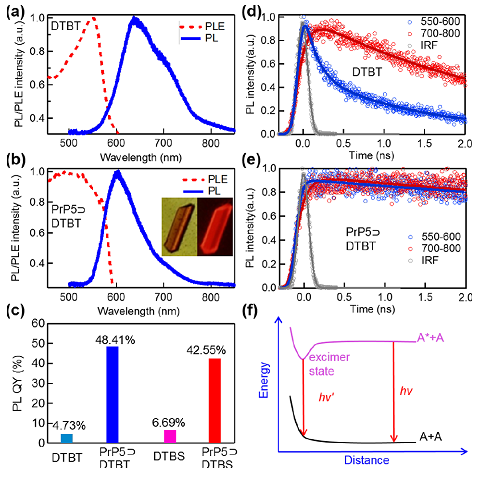 6aDTBT晶体和(bPrP5DTBT共晶的PLPLE光谱(插图显示PrP5DTBT单晶的光学和荧光图像)。(c)纯客体晶体和相应的主-客体复合共晶体的PL量子产率。特定发射波长范围下(dDTBT晶体和(ePrP5DTBT共晶体的时间相关单光子计数衰减曲线。(f)势能-距离关系曲线,表明受激准分子的形成是由于随着A *(处于第一激发单重态的单体)和A(处于基态的分子)的接近,它们之间的键合增加,使两者的势能在激发态表面产生最小值,该过程形成的准分子状态将导致单体激发态发射的猝灭。