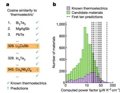 在文章中,作者筛选材料文献库词频大于3,并同时出现在密度泛函理论(DFT)计算热电效率因子数据集的9483种化合物,其中7663种在之前的文献报道中从未与热电领域关键词共同出现过,因此被视为可能具有热电性质的候选材料。图4a表示Li2CuSb和Cu3Nb2O8被预测为具有热电性质的材料,但未在文献中被报导;而在前10项预测的候选材料中,其分布如图4b所示,所有计算出的热电效率因子都略高于已知热电材料的平均值(17.0 μW K-2 cm-1)。